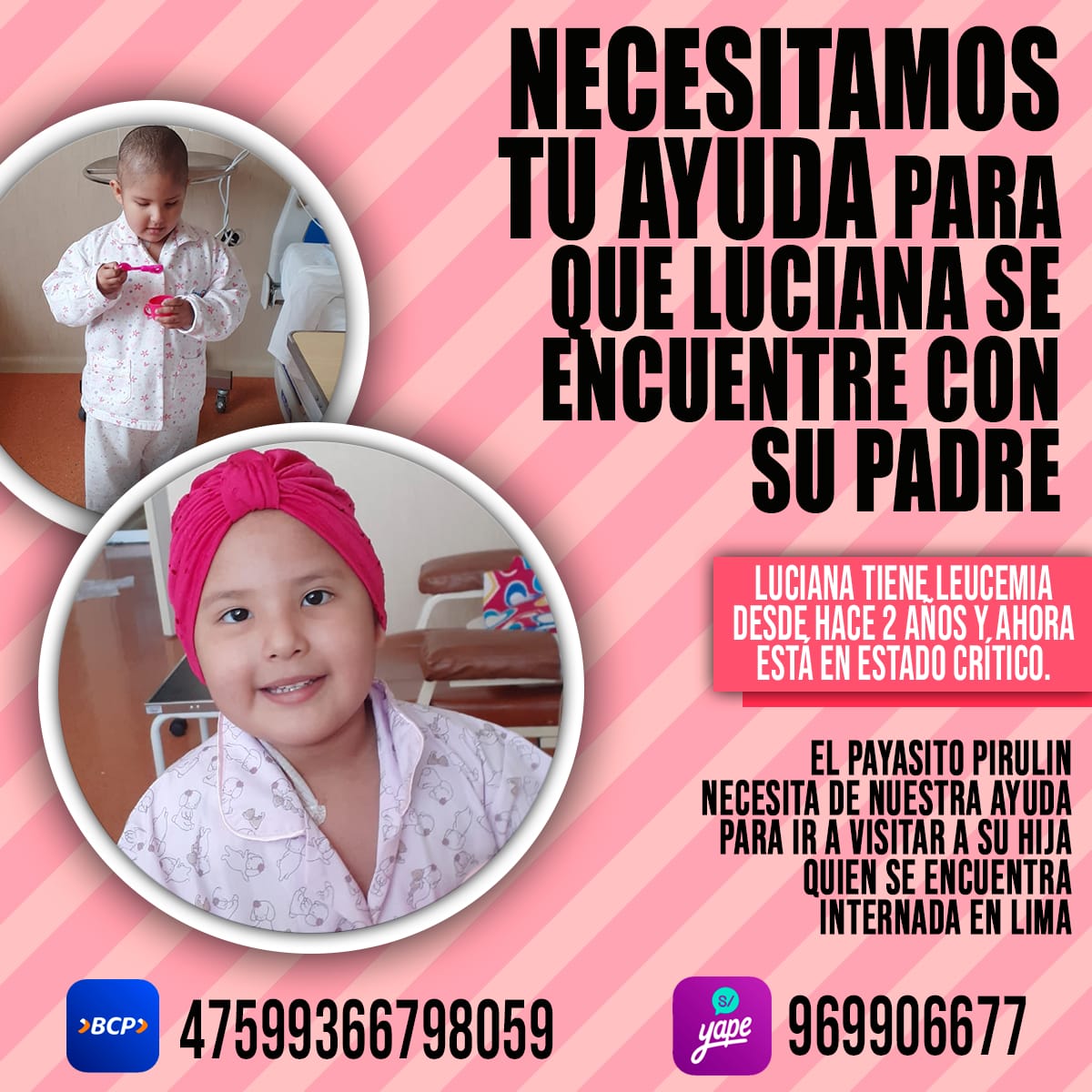 La pequeña Lucianita, de cuatro años, viene luchando por su vida contra la Leucemia que le detectaron hace dos años. La hija de Julio César Vidal, conocido como Pirulín, y de su esposa Kelly Calderón se encuentra grave y necesita el apoyo de todos.